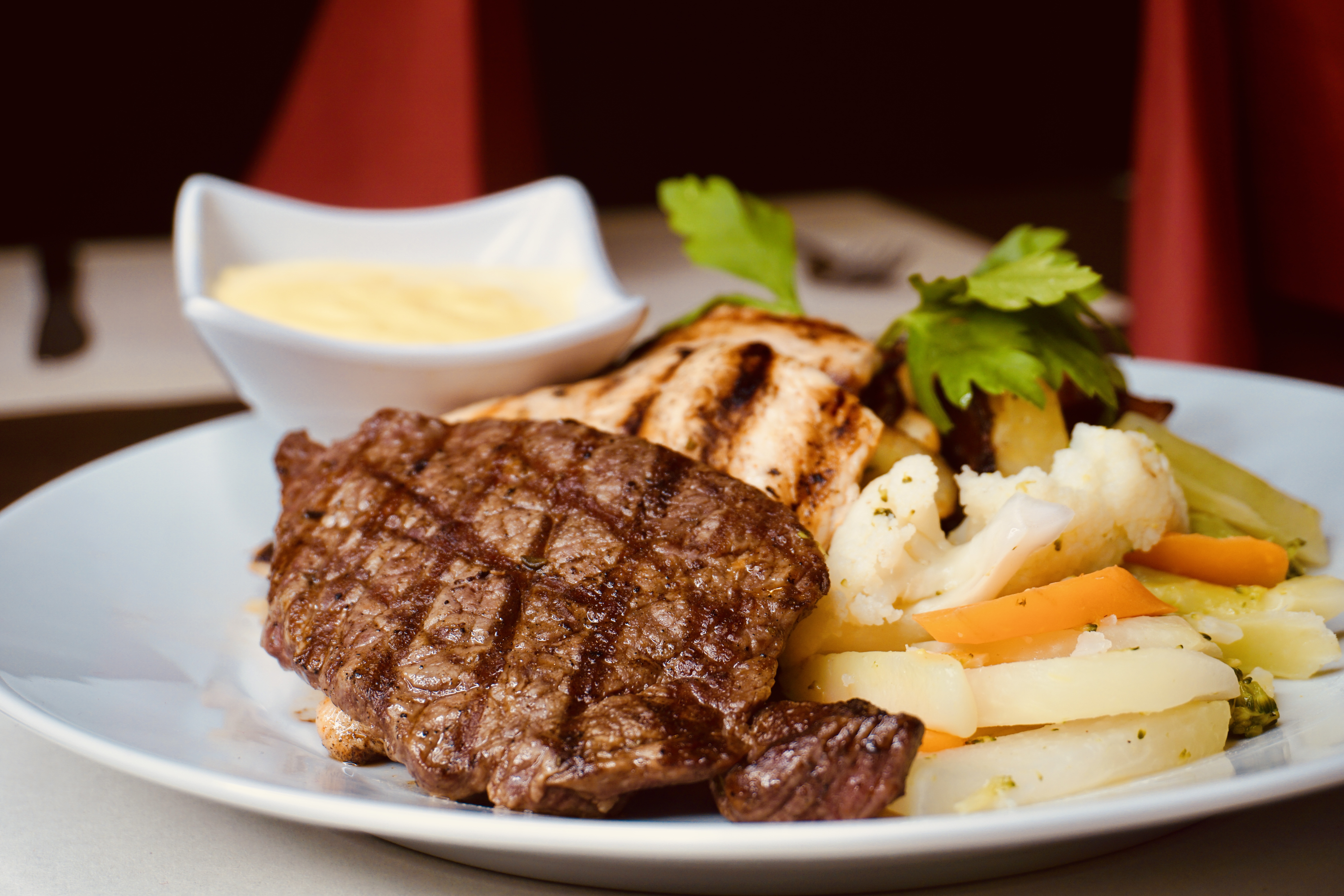 Je ein Steak vom Rind, Schwein & Hähnchen mit Bratkartoffeln, Marktgemüse & Sauce Hollandaise.