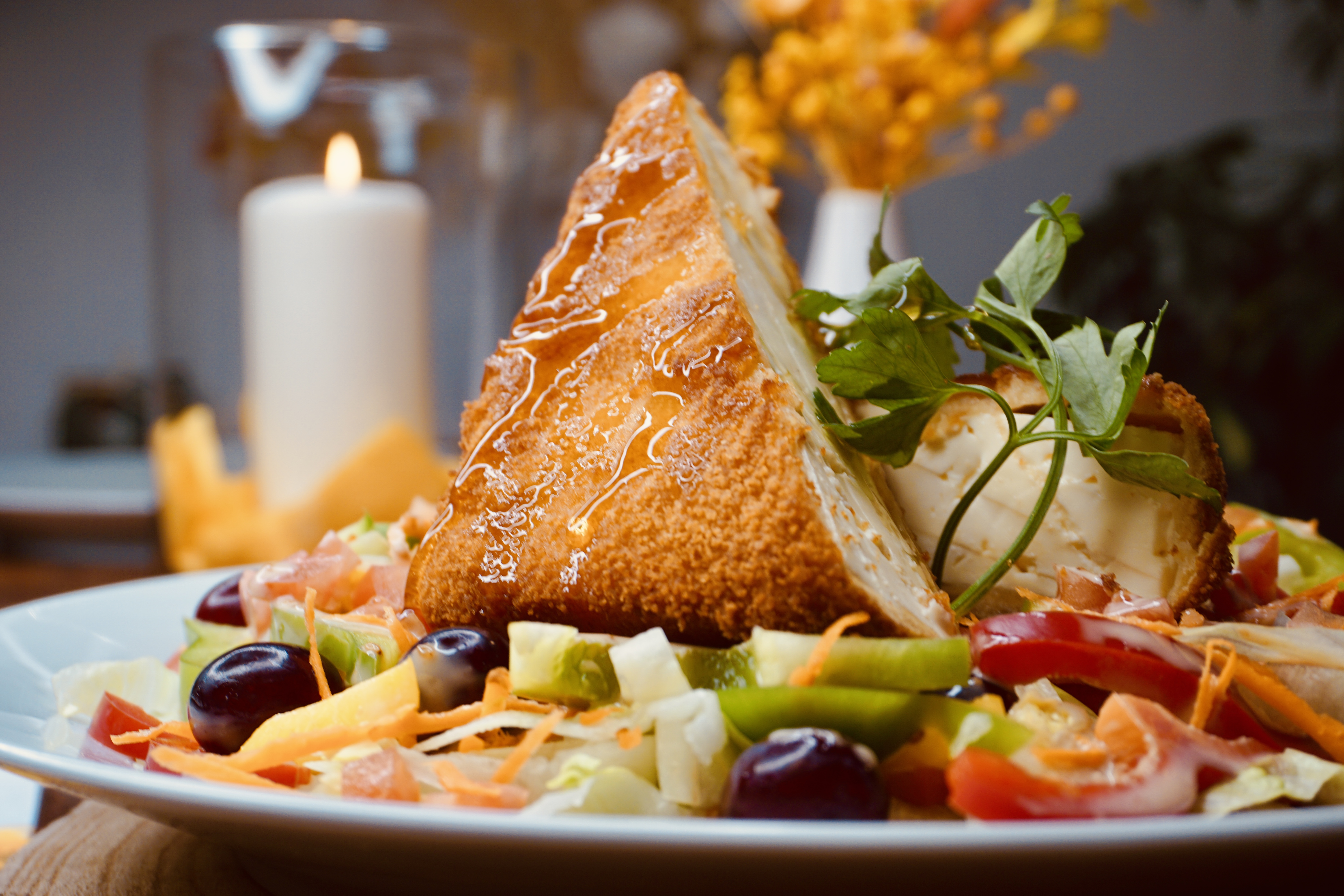 Panierter Schafskäse mit Honig, serviert auf Blattsalat mit Gurken, Paprika, Karotten, Senf-Honig-Dressing und Pinienkernen.